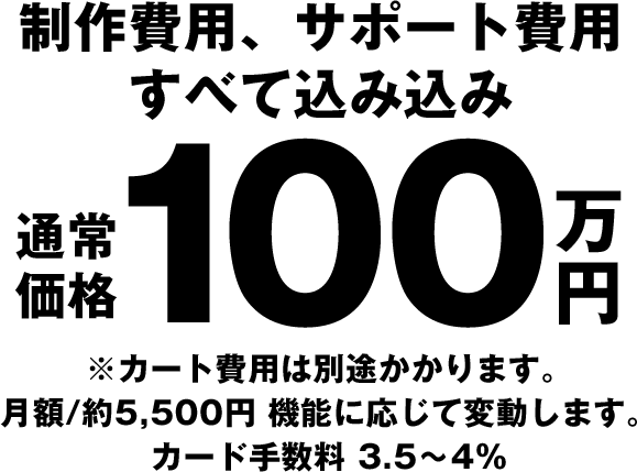 | 100万円の内訳 | ある程度の商品情報や写真など情報があるものを構築する。オープンしてから月額20万円程度の運営更新費用などもオプションである場合が多い。 |